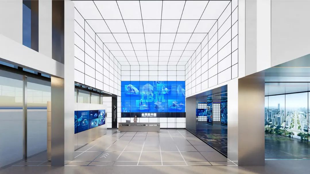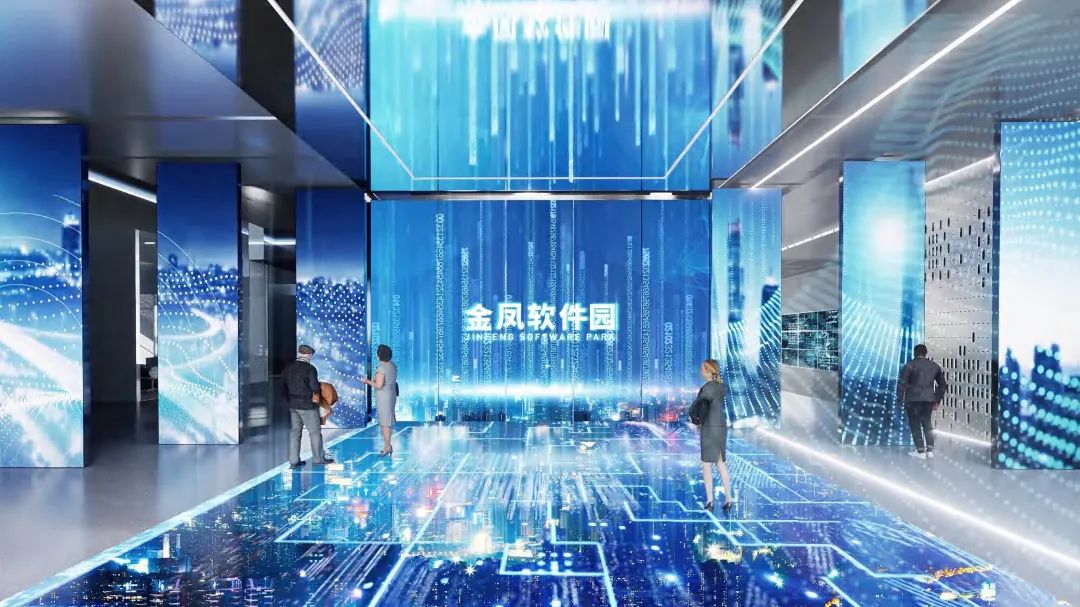 序厅位于金凤软件园的一层,其正中间墙面设置有49英⼨DID拼接屏,通过情境化、可视化地呈现金凤软件园的入驻企业概况和各企业年产值等相关数据,详细介绍了园区的指导思想和主要目标。